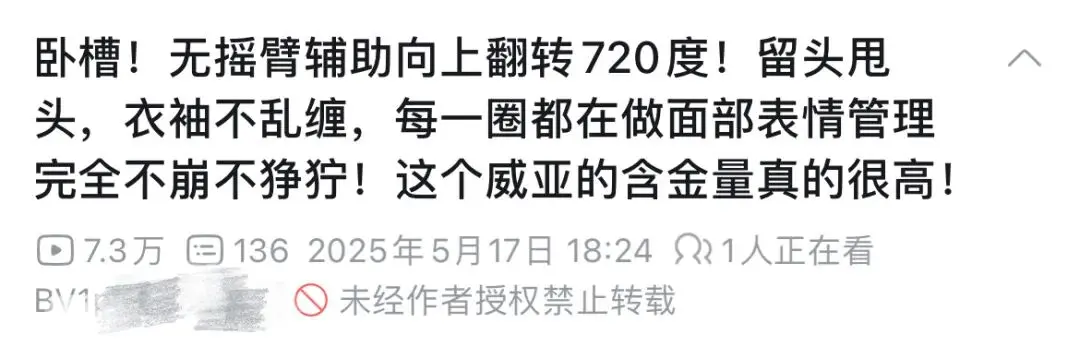 局部拆分也是非常流行的吹法。吊威亚,可以吹飞得稳、核心强,翻滚无需借助小绿人;拿兵器,可以吹拔剑、收剑、转剑、抹剑的姿势好看,演员为拍戏学会了耍奇门兵刃;还有吹具体动作,像什么空中一字马、旋转六周半;还能吹更更具体的细节,如转圈留头,表情不崩。